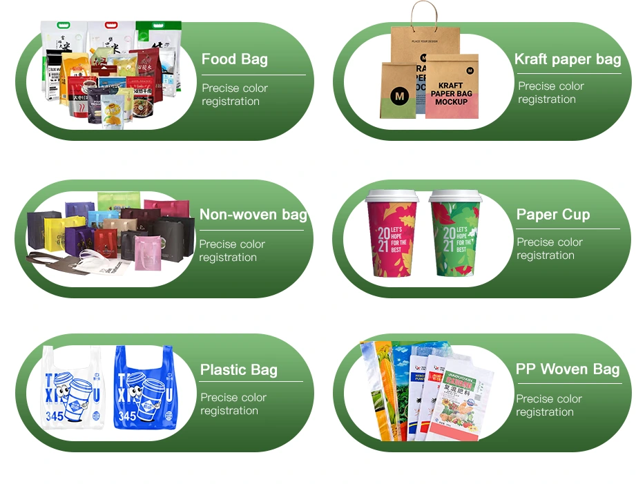 Mendukung pencetakan 6 warna penuh dengan registrasi warna ultra-presisi (±0,1 mm), menghasilkan grafik tajam, pola jelas, dan cakupan tinta seragam untuk hasil kemasan berkualitas tinggi.